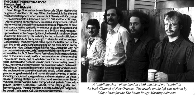 I had a GREAT band for a couple of years featuring the legendary Tommy Comeaux as multi-instrumentalist on guitar, mandolin, saxophone, and pedal steel. When our manager at the time saw this publicity photo he said... "You look like convicts!" The band also featured the amazing "Charlie Watts type precision" drumming of Steve Wheless. Steve held my insanity back in the same way that Charlie Watts does with Keith Richards. It gave us an edge. Here is some of our publicity and a sound file of us opening up for Johnny Winter at a New Orleans club called "Old Man River".